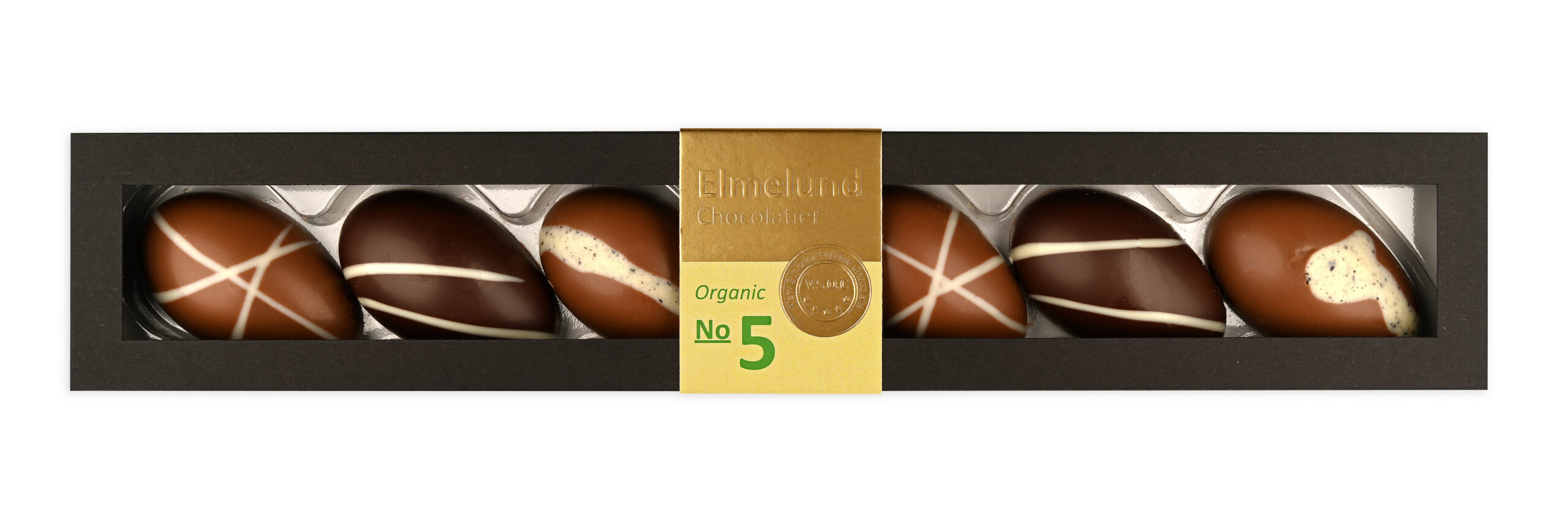 Gaveæske med 6 fyldte påskeæg. Varianterne er solbær i en skal af 70% mørk chokolade, lakrids i en skal af mælkechokolade og til sidst mandelnougat og lemon i en skal af mælkechokolade.