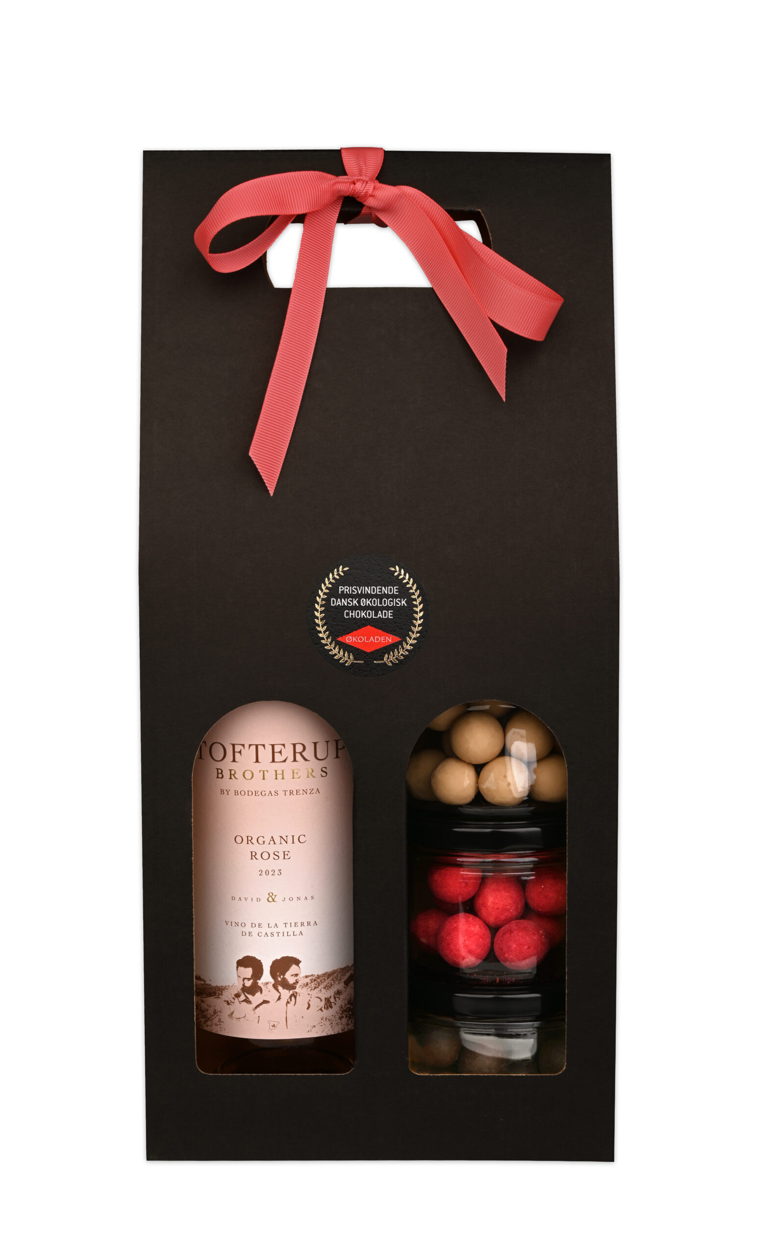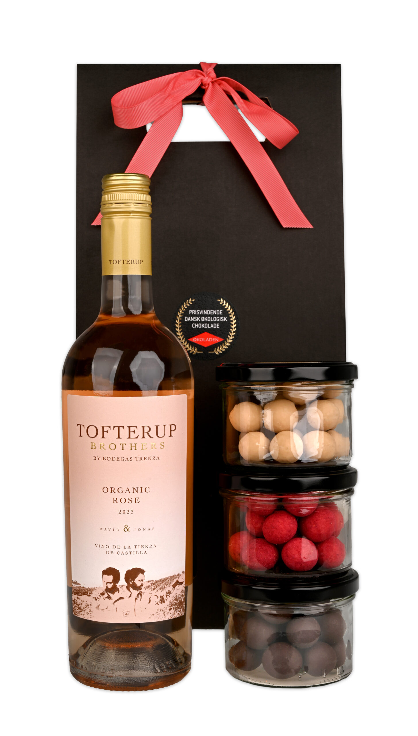 Den økologiske rosé fra Tofterup Brothers, er en af de bedste roséer på markedet og passer perfekt sammen med økologisk kvalitetschokolade fra Økoladen & Elmelund.