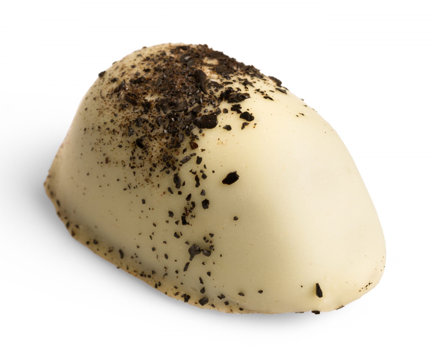 Marcipanæg med lakridsmarcipan, overtrukket med hvid chokolade og dekoreret med knust rålakrids. Marcipanen er lavet ved at blande lakridspulver samt lakridslikør i marcipanen. Dette skaber en gennemtrængende og lækker smag af lakrids gennem hele stykket. Den hvide chokolade passer som bekendt utrolig godt sammen med lakridsen og binder hele smagsoplevelsen sammen.