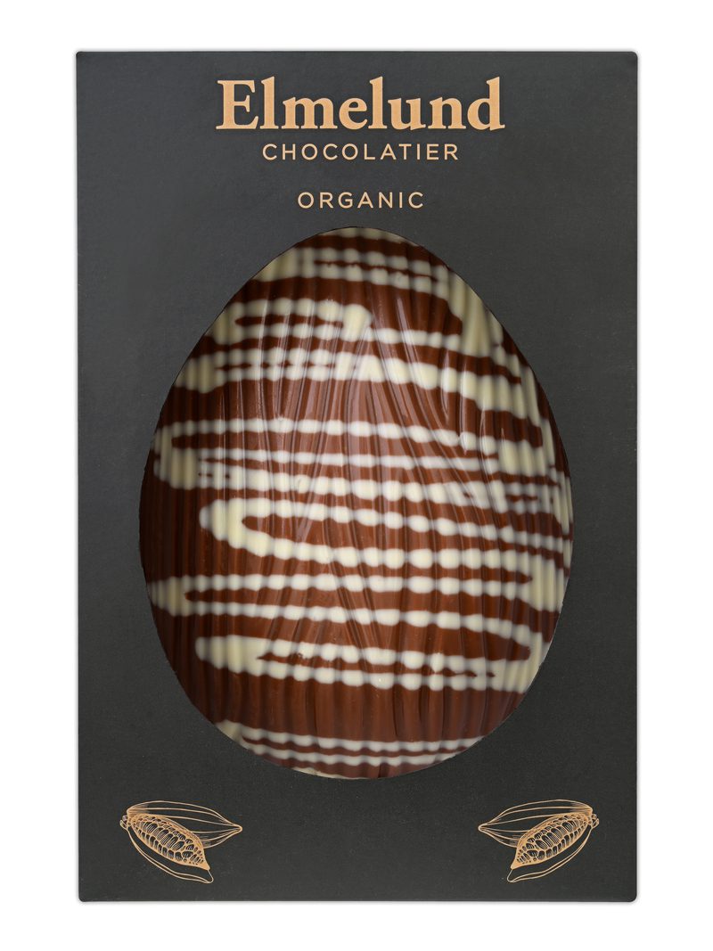 Støbt Påskeæg med 41% mælkechokolade pyntet med hvid chokolade.